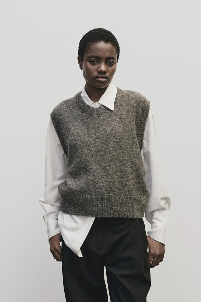 Mijeong Park wool blend v-neck sweater vest in heather brown.