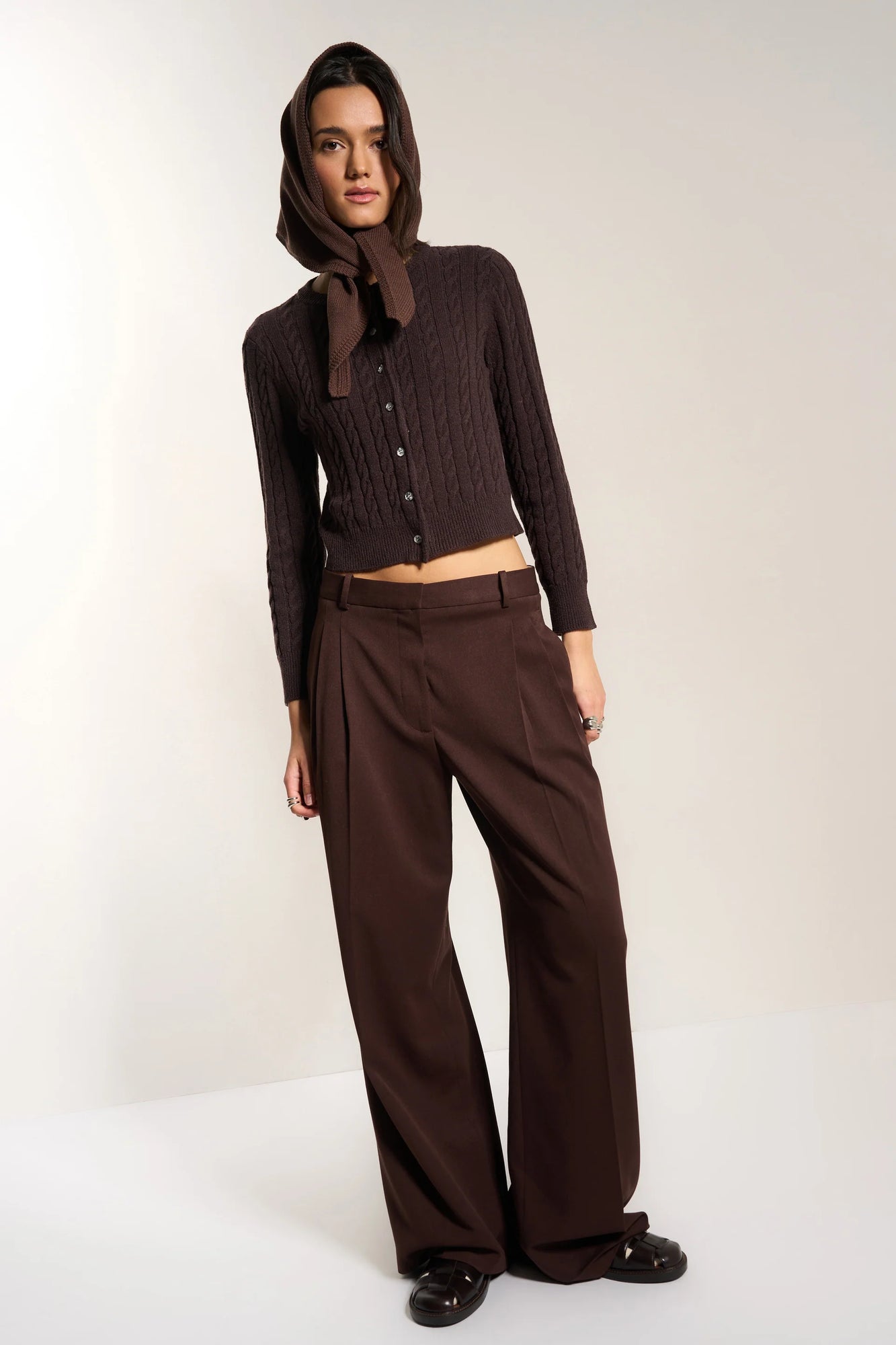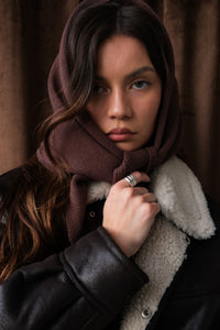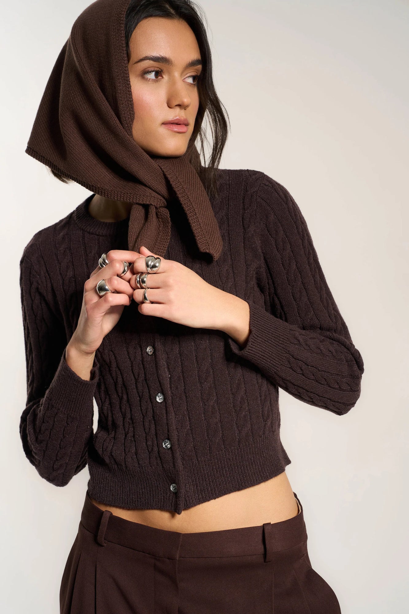 Callahan Handkerchief knit scarf in chocolate brown. Made of a cotton blend, this knitted scarf has a handmade look and is the perfect way to complete your look.
