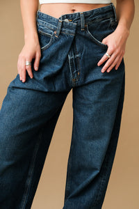 Agolde Vana Fold Jean in Nexus dark blue, makes a bold impression with it's signature fold-over waistband. Designed with a mid rise and intentionally oversized, relaxed fit, this style is crafted from rigid regenerative cotton for a soft yet structured feel.
