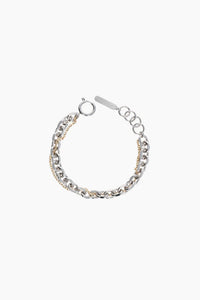 Justine Clenquet Dana bracelet with pale gold thin curb chain layered with a silver-tone thick curb chain. Logo charm on one end. Spring-ring clasp and adjustable rings.
