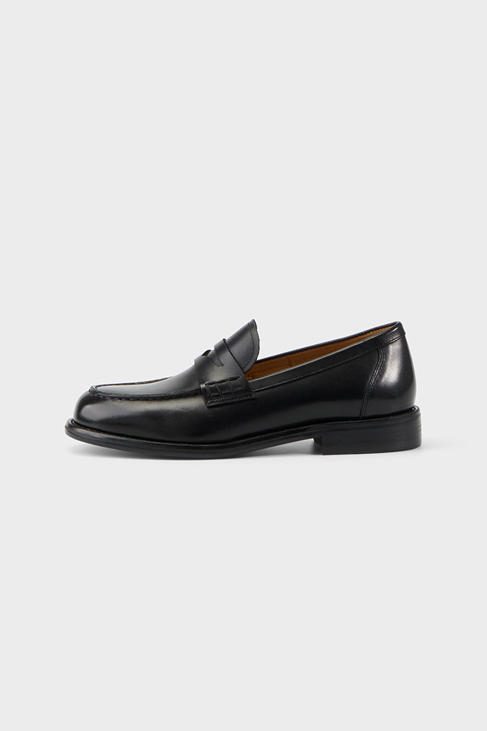 Vagabond Linn black leather penny loafers. Mock toe seam.