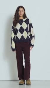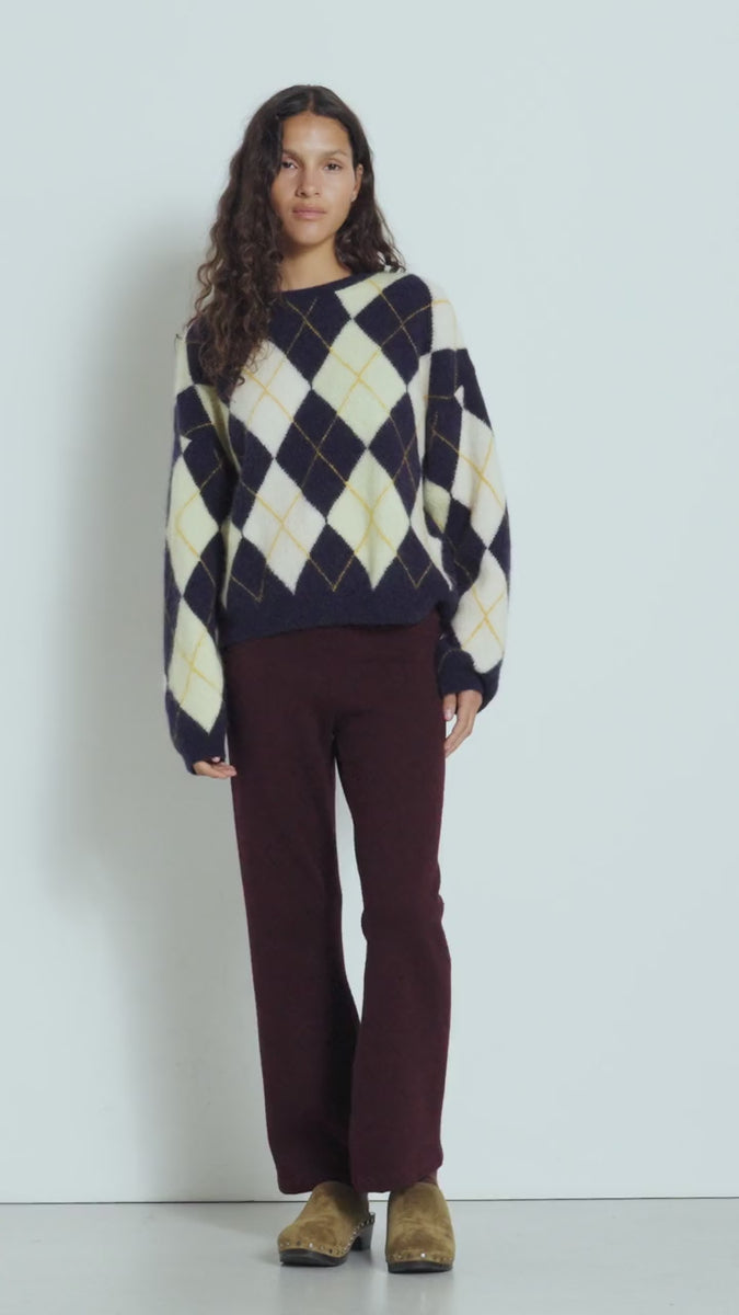 American Vintage pull over cardigan in navy and butter yellow argyle.