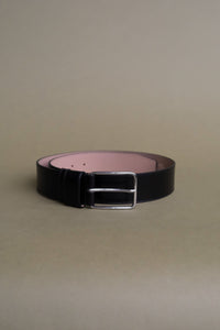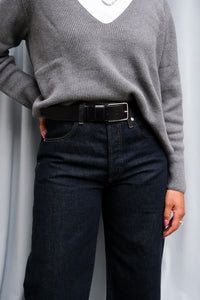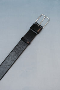 B-low the Belt hip Enzo Rugous belt in black with silver hardware. Slightly dstressed leather strap, this hip belt features a minimal silver buckle and intricate edge stitching.