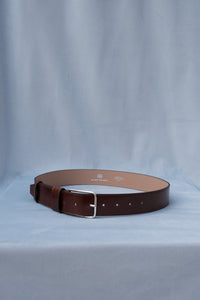 B-low the Belt hip Enzo Rugous belt in sepia brown with silver hardware. Slightly dstressed leather strap, this hip belt features a minimal silver buckle and intricate edge stitching.