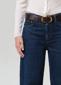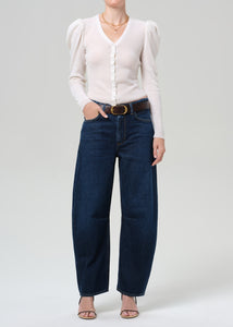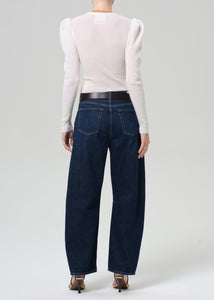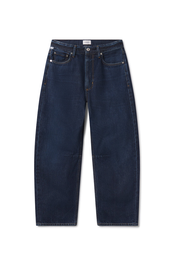 Citizens of Hummanity Miro relaxed long tapered jeans in dark indigo Medina wash. The silhouette tapers to the ankle, creating a clean, contemporary line. Zip fly.