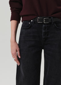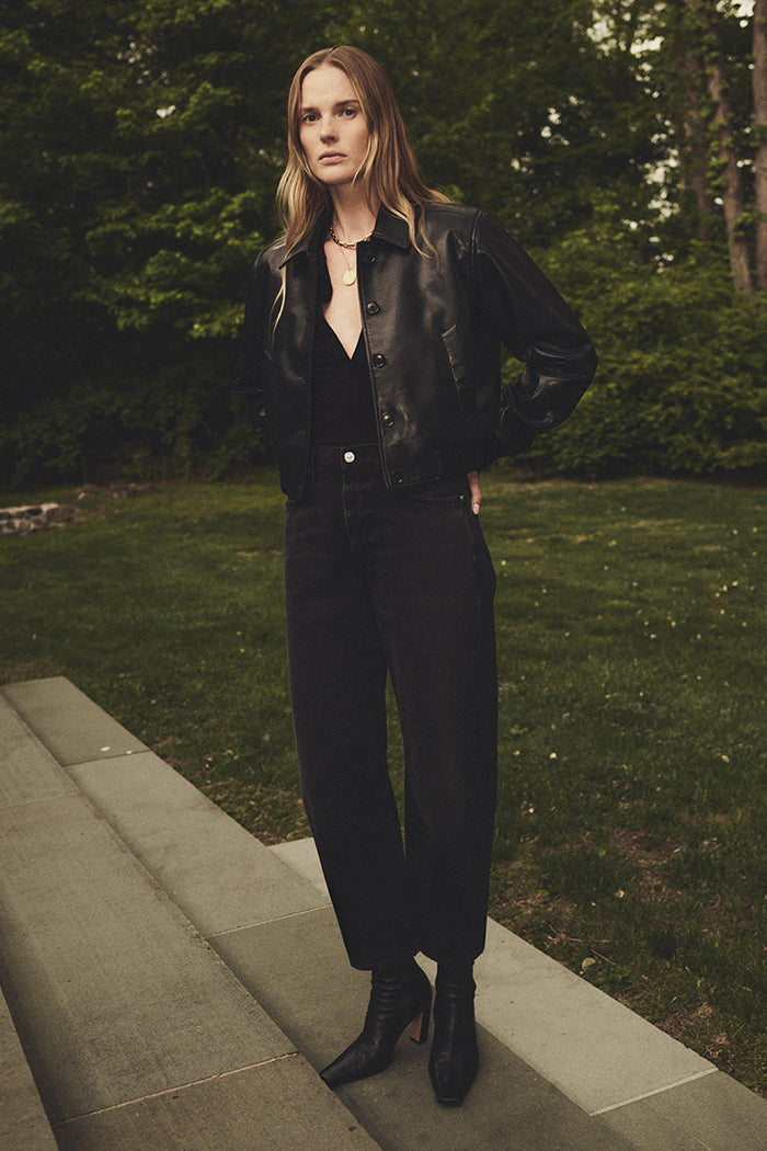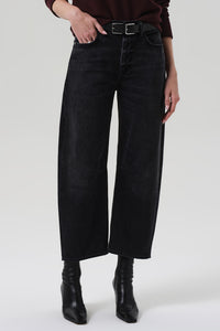 Citizens of Humanity Miro jean in Raine washed black. Slightly relaxed top block and tapered take on the barrel leg silhouette. Medium indigo with fading, in a non stretch rigid cotton with vintage hand feel. Zip fly.