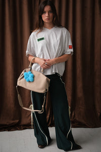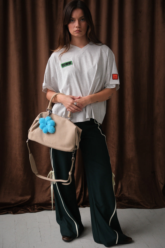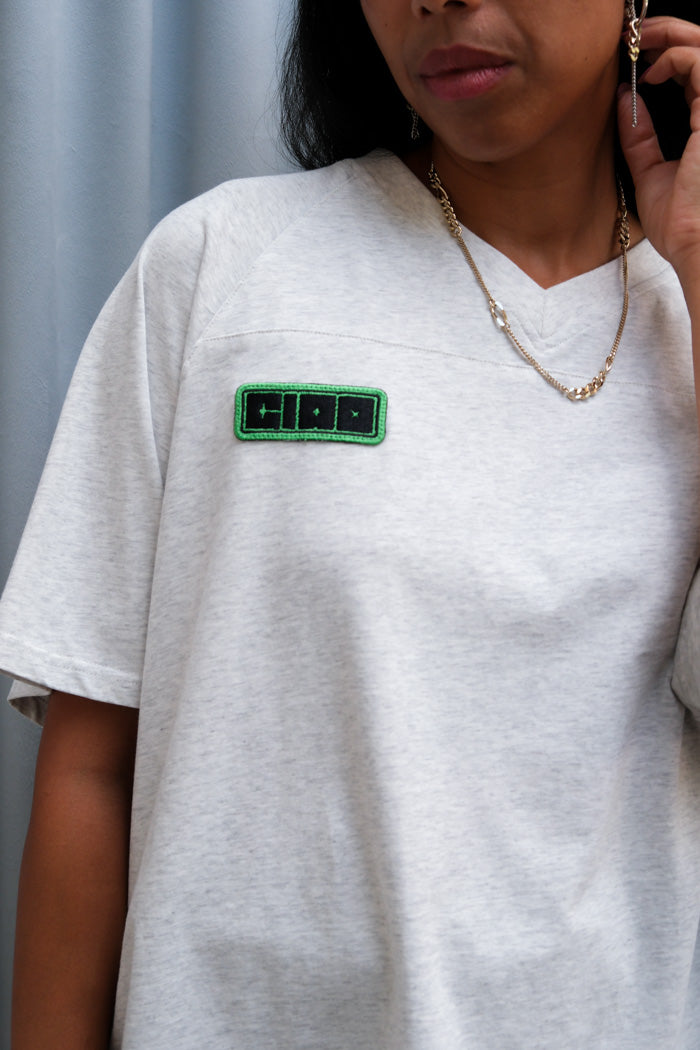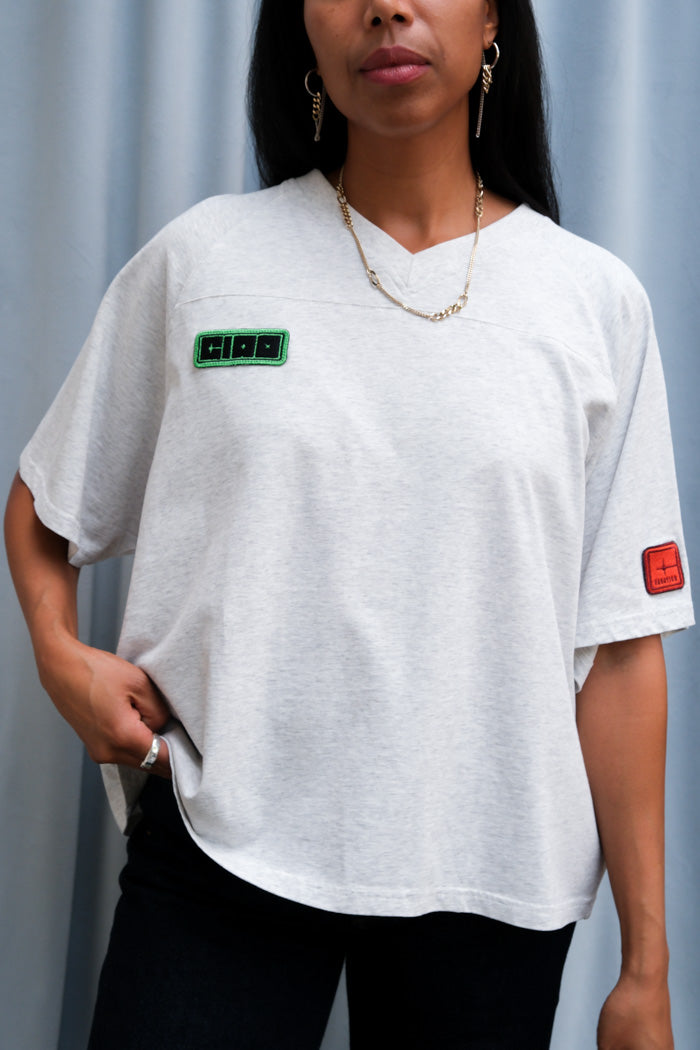 Ciao Ciao Wiley raglan cropped v neck jersey style tee in light ash heather grey. Retro inspired patches, and cropped relaxed fit.
