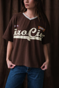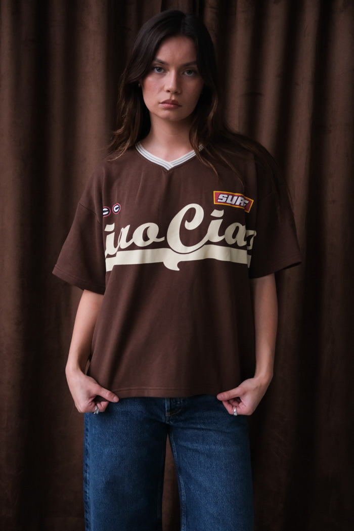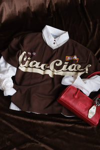 Ciao Ciao chocolate brown vintage inspired Enzo t-shirt sport jersey. A relaxed-fit, featuring bold "Ciao Ciao" lettering, sporty patches and an effortless oversized silhouette. This piece blends retro charm with modern ease. This beautiful color was custom made just for Pipe and Row 🩵