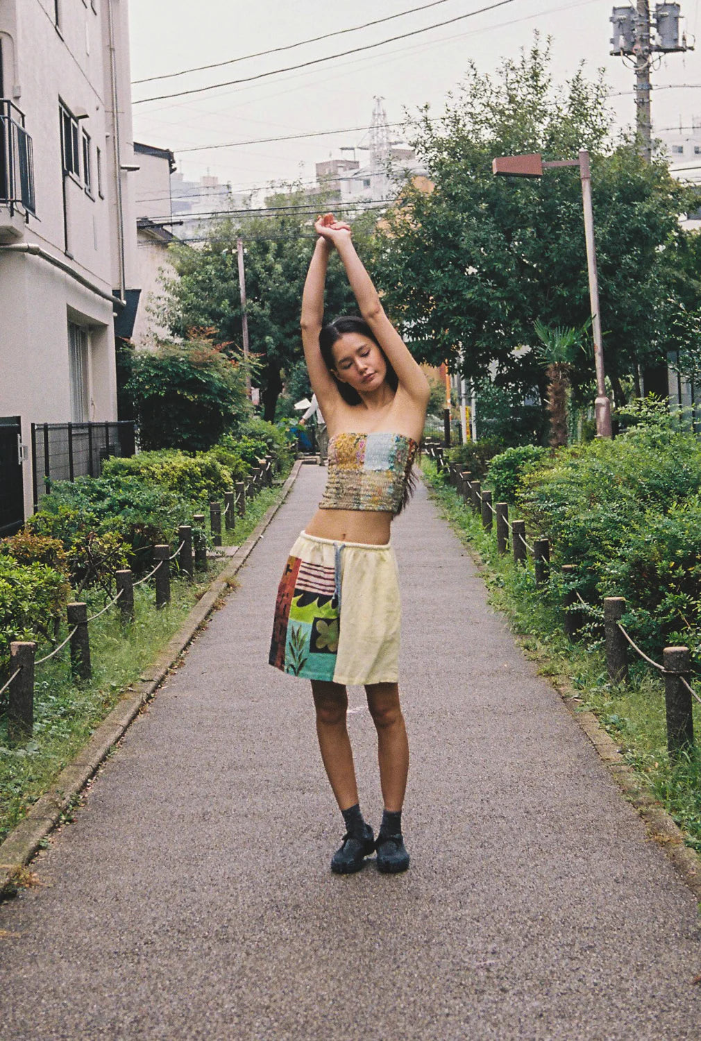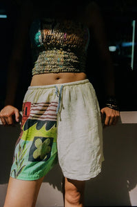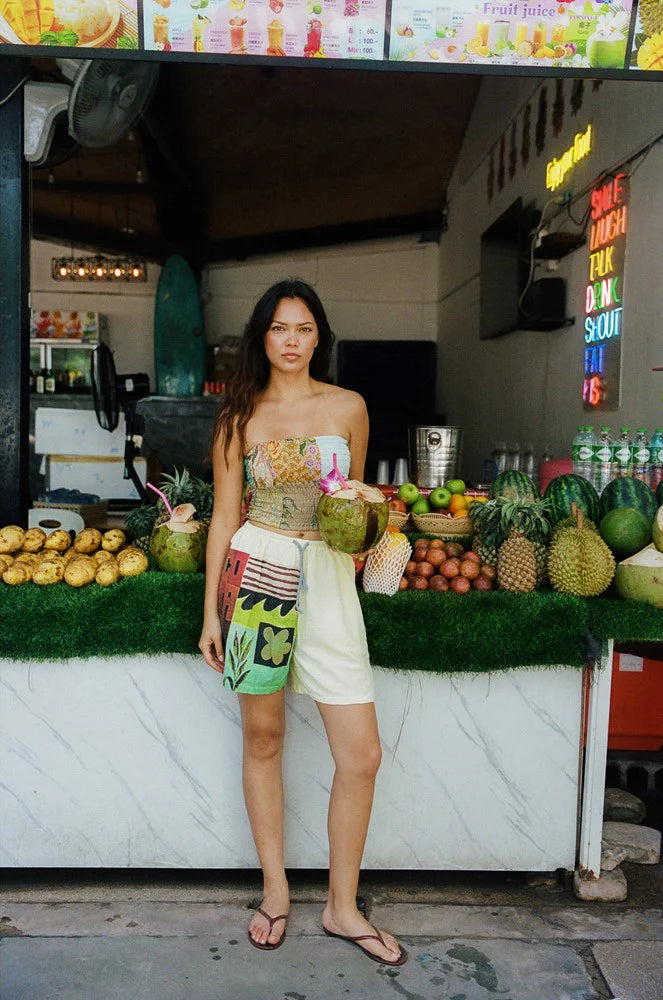Ciao Ciao spice collage riley block print shorts. From tropical florals to earthy textures, the collage design brings a handcrafted, one-of-a-kind energy to a simple, wearable silhouette. Cut from lightweight cotton with a relaxed fit, the shorts sit comfortably on the waist with a drawstring tie that nods to vintage beachwear. Adjustable drawstring.