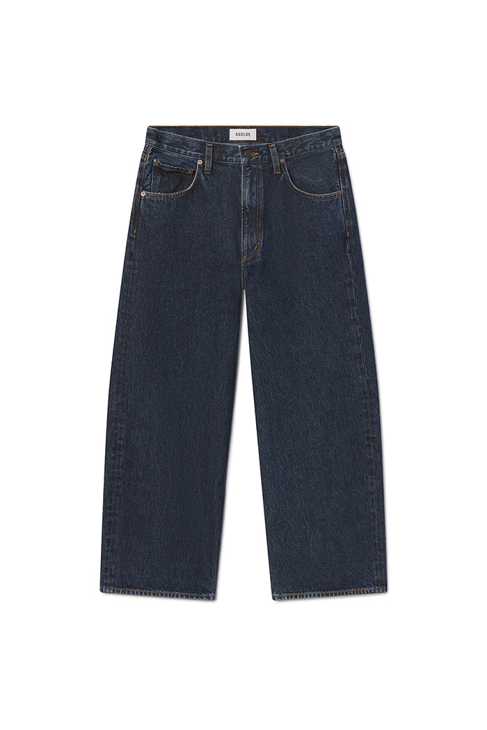 Agolde Low Curve Jean Crop in pendulum medium indigo wash. A relaxed, tapered leg and slouchy fit that sits low on the hips, now with a slightly cropped 27.5" inseam. Crafted from rigid, non-stretch denim, this dark-to-medium indigo wash is finished with subtle marbling for added depth.