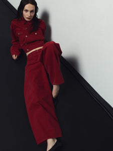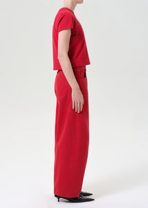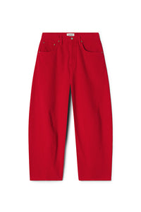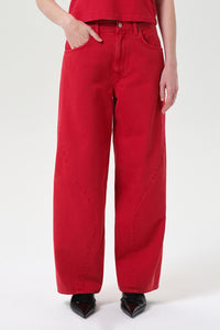 Agolde mid rise, Twist jean in tomato red. A relaxed, subtle sculptural shape, defined by its signature twisted outseam. Crafted from rigid, medium red denim with marbled character, this standout silhouette brings an unexpected edge to any look.