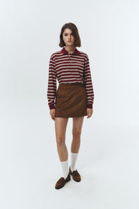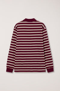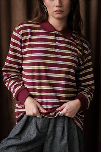 Dunst unisex collared long sleeve polo t-shirt in burgundy, butter yellow, and soft yellow multi stripe. Soft hand and lightweight.