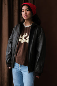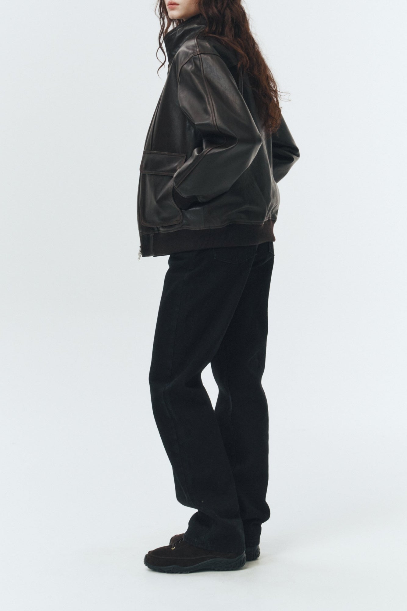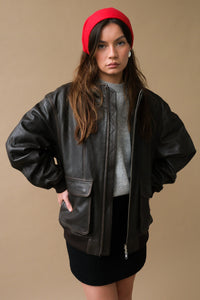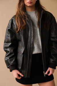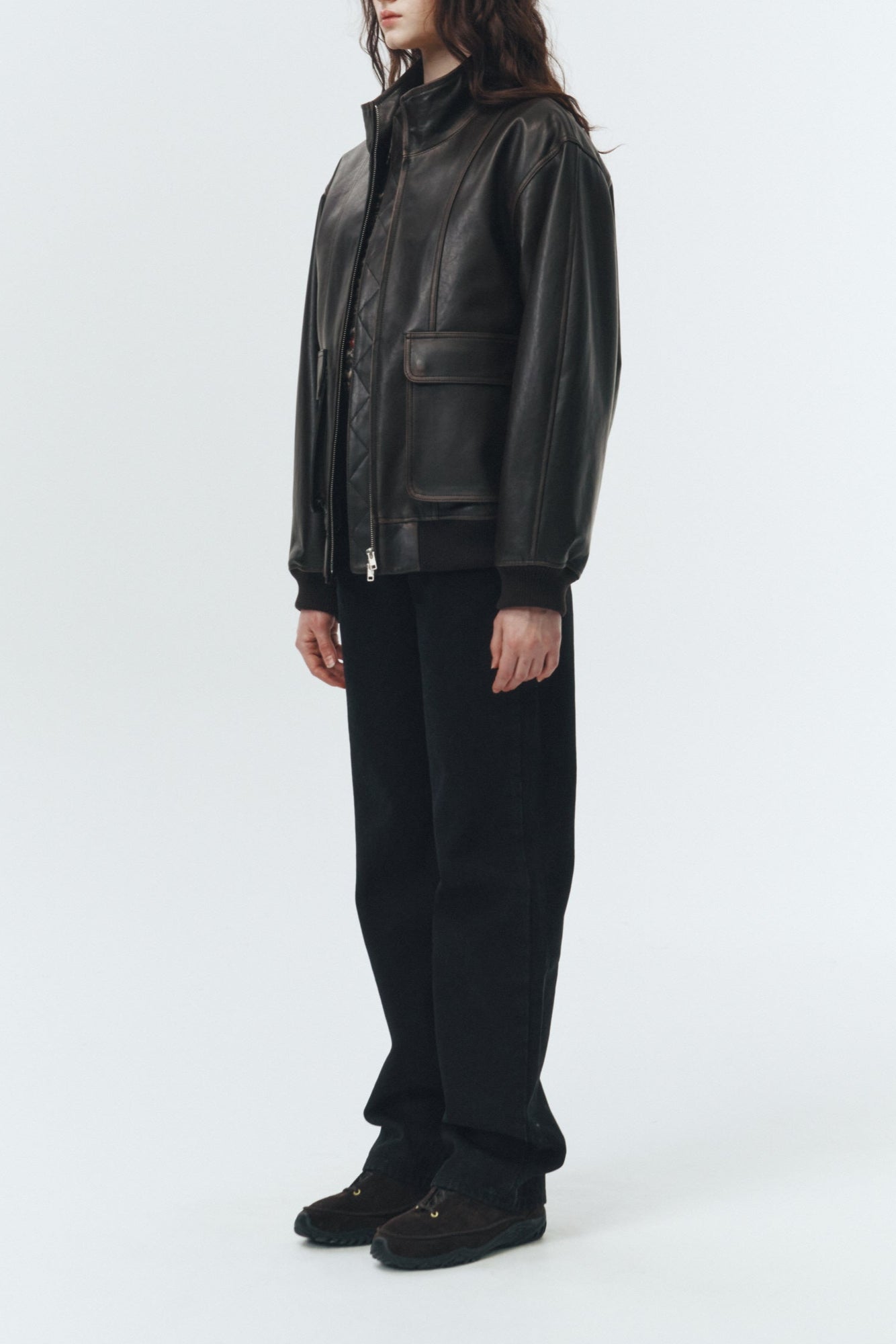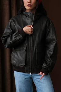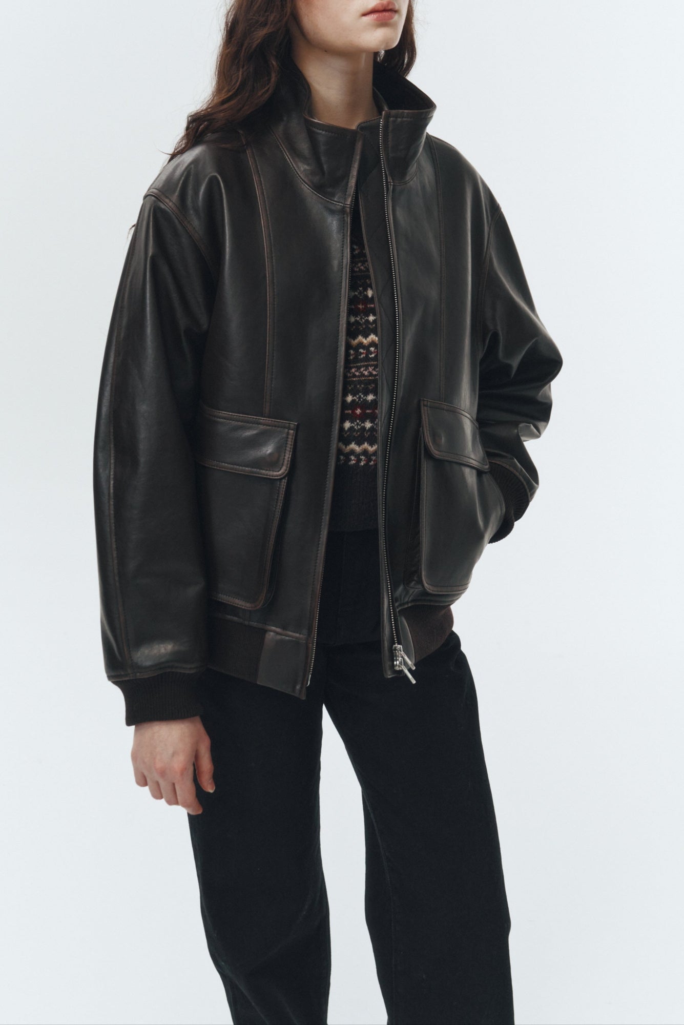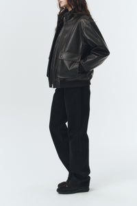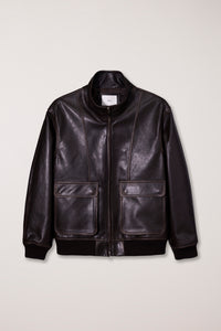 Dunst unisex stand collared leather aviator bomber jacket in dark brown. Two way zip front, dropped shoulders, flap cargo pockets with snaps.