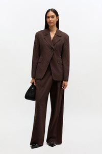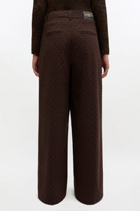 Ganni cross-over front, polka dot flocked check mid waist trouser pants in chickory coffee brown. Hook-and-eye closure, belt loops, and side pockets.