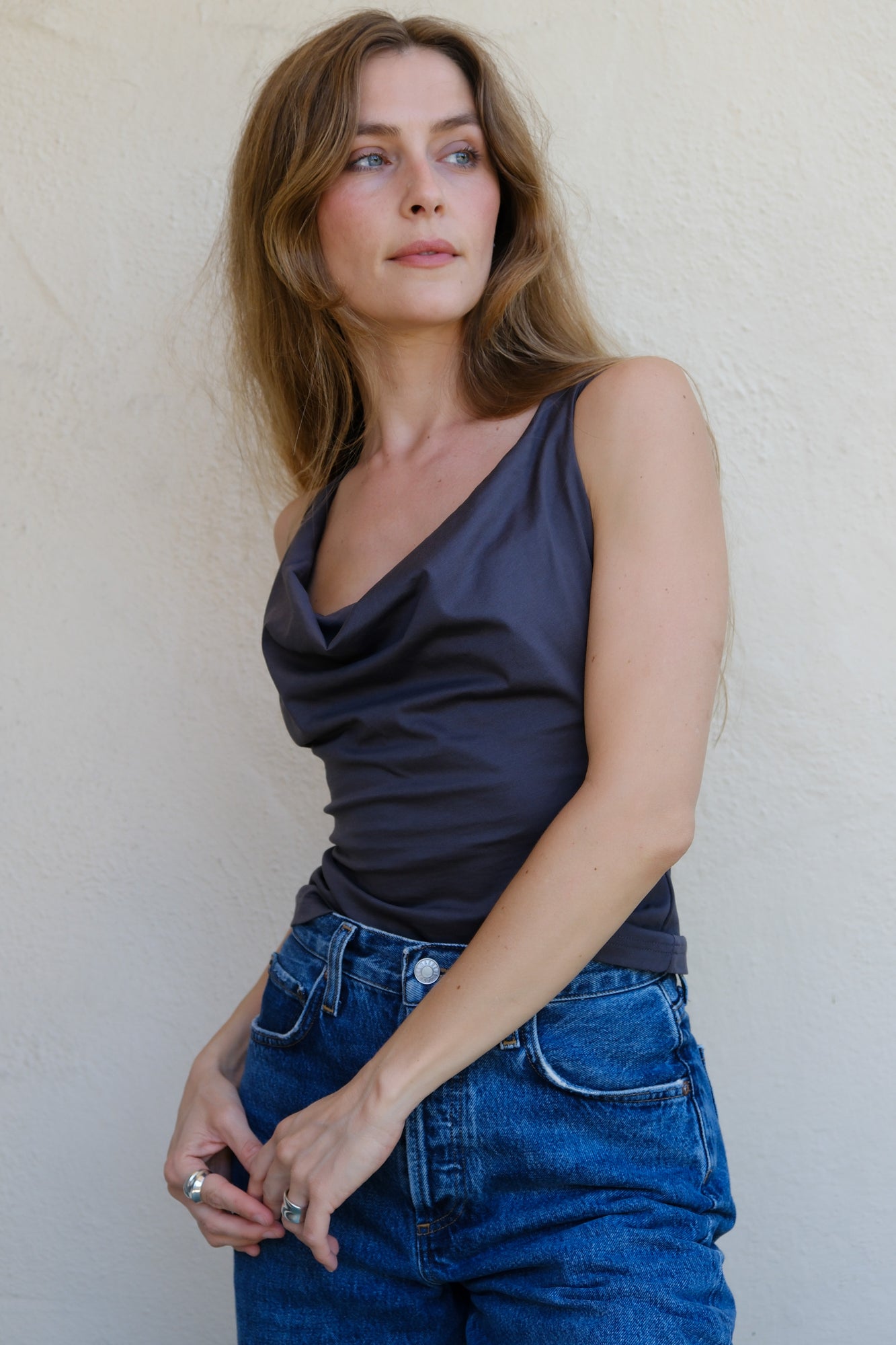Geel charcoal Jameson bias cut, draped cowl neck tank top.