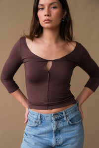 Geel three-quarter sleeve Mason keyhole plunge top in hickory brown.