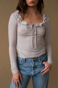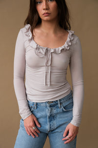 Geel semi-sheer stretchy long sleeve top featuring a ruffle neckline in fog.