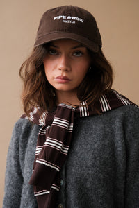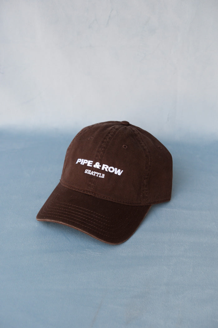 "Pipe & Row Seattle" front embroidered on a chocolate brown cotton hat with white thread.