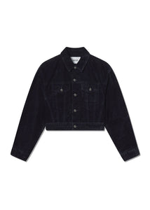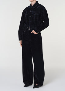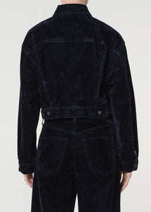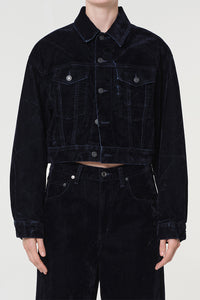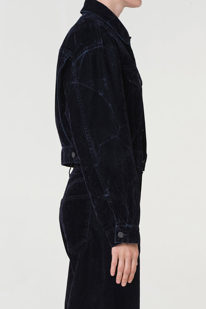 Agolde cinch waist, cropped denim jacket in crackled navy blue crush velvet.