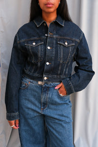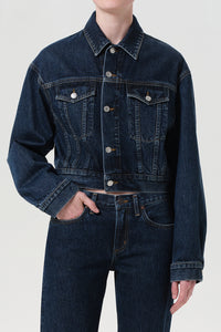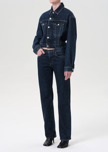 Agolde cropped, denim, jean, Radley Jacket in veneer clean dark indigo. A structured denim silhouette offered in a clean, saturated red hue. Crafted from rigid, non-stretch cotton denim, it features a defined waist, button front, and timeless trucker details. Pair with tonal reds or vintage-wash denim for an unexpected twist.