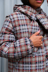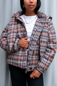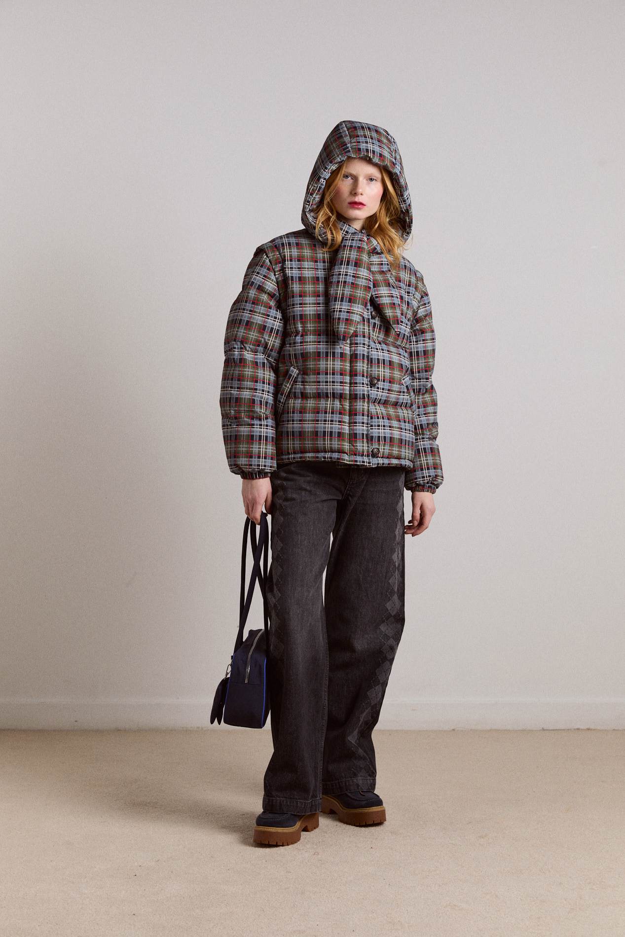 Damson Madder hooded Pearl multi check plaid puffer coat jacket. Hood and arms are removable to transform into a vest.
