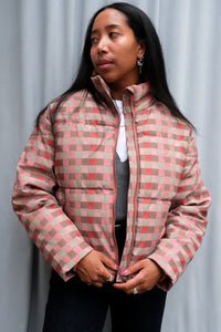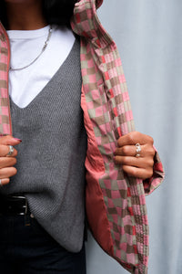 Thinking Mu square fit Gemma jacket in Julia colors pink and tan check with a zip closure.