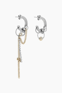 Justine Clenquet Amber earrings feature silver-tone round hoop earrings. One earring features a small ring accented with a pale gold ball bead. The other features a rhinestone-encrusted chain paired with a pale gold chain, detailed with various knots. Post-back fastening for pierced ears.