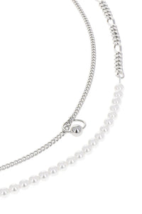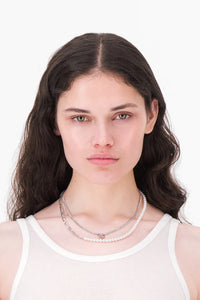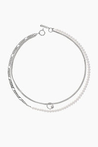 Justine Clenquet Willy silver-tone link chain and off-white pearl chain necklace. Features a silver-tone ring and a ball bead detail. Spring-ring clasp and logo charm.