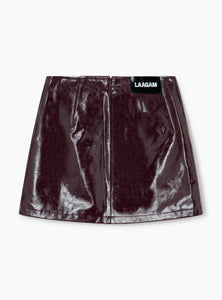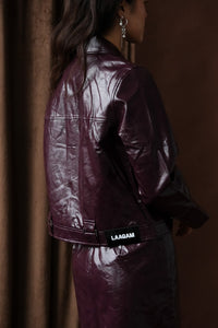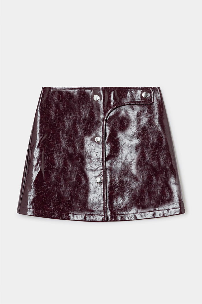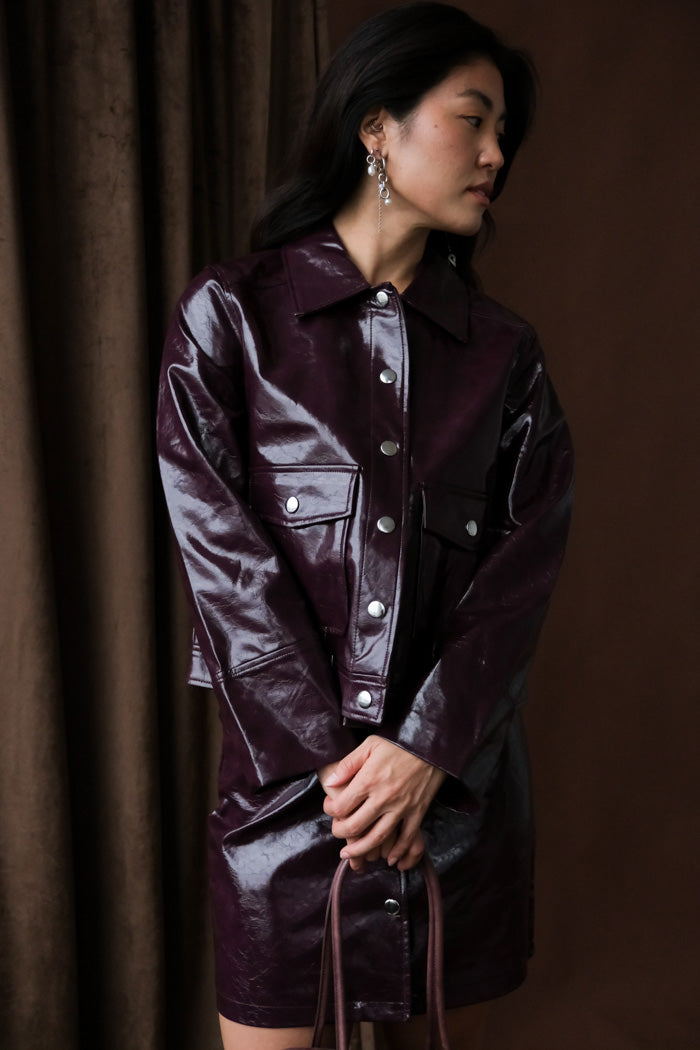 Laagam faux leather Lena mini skirt in plum. High-waist, asymmetrical front closure with metallic silver snap buttons. Back closure with invisible zipper and black lining. Pair with the matching Bruna jacket for a matching set.
