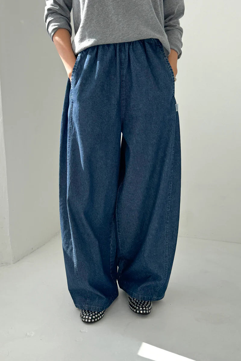 Le Bon Shoppe parachute pant in denim blue. Crafted from a light yet durable and elevated cotton they're the kind of pair you can wear anywhere, from casual moments to polished looks. Designed with an elastic waist and side pockets, their unique leg shape sets them apart. A third side panel adds extra volume, creating a sculptural silhouette that’s relaxed, airy, and full of movement.