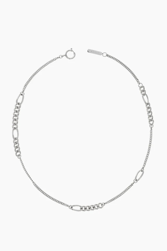 Justine Clenquet multi chain Tiko necklace in silver palladium. Spring-ring clasp and logo charm.