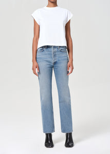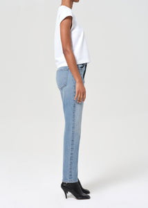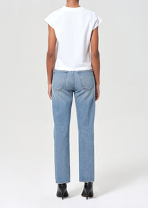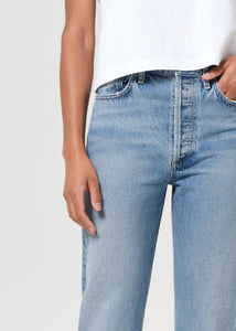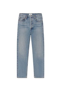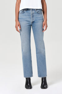 Agolde 90's Pinch Waist Jean in medium indigo worn marble stage wash. Straight leg jean with ease through the thighs. Subtle fading, marbling, and whiskering enhance the high-rise silhouette with a classic button fly, creating a clean yet lived-in look. Medium marbled worn indigo denim adds a relaxed, versatile tone.