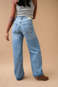 Citizens of Humanity Ayla baggy jean in medium light indigo Cupid wash. The ‘Ayla’ jean offers a refined take on the baggy silhouette with a relaxed fit that sits away from the body while maintaining a clean, intentional shape. Crafted from rigid regenerative cotton with a soft hand, it’s an easy staple that styles effortlessly. Can be styled cuffed up once or twice and creates a perfect clean fold. Button fly.