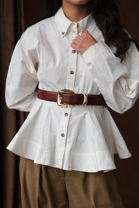Na Nin Delaney belt in smooth brown embossed croc and custom gold hardware.