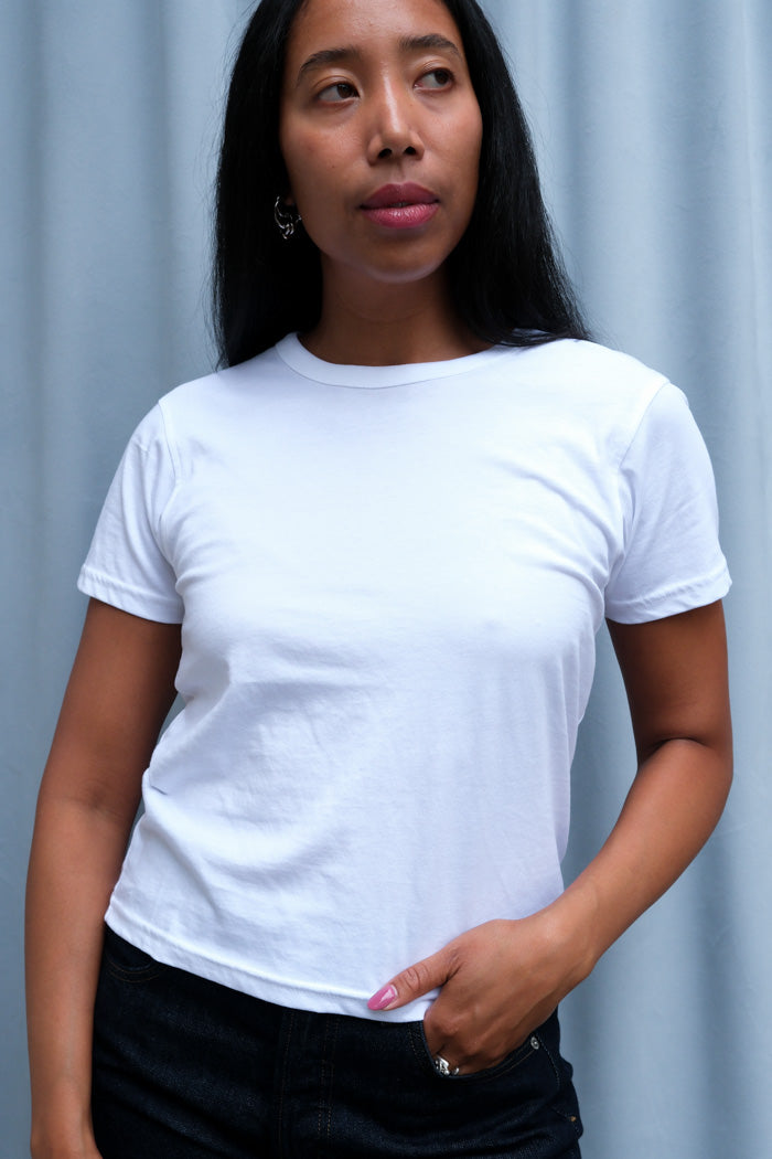 Soldout.NYC crewneck, slim cut Shrunken perfect tee in white luxe cotton. Center seam down back.