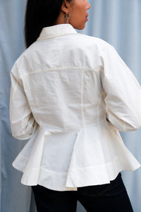 Ganni stretch cotton peplum button up shirt in egret off white.