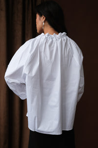 Toit Volant Nightingale Top in white with large black bow in the front.