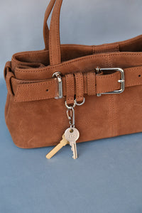 Marge Sherwood belted Shoulder Brocle Mini handbag in nubuck brown leather. Comes complete with two detachable key charms. Magnetic press closure.