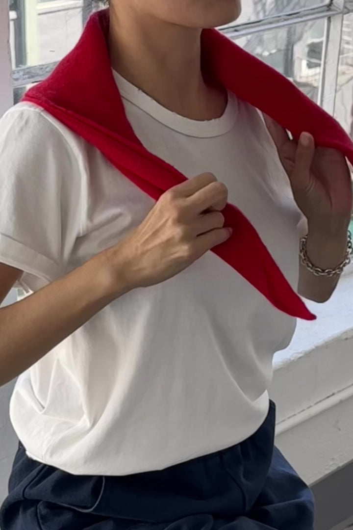 Le Bon Shoppe cashmere bandana in red. An elegant revival of the classic square kerchief. The beauty of this super soft accessory lies in its adaptability. Styling options are endless, whether worn as a neck scarf or styled as a head bandana.