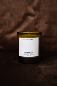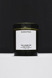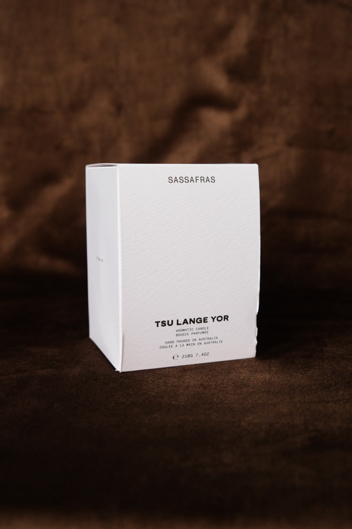 Tsu Lange Yor sassafras candle—woods, smoke, warm spice, leather. A bridge to the dandenong ranges, AU.