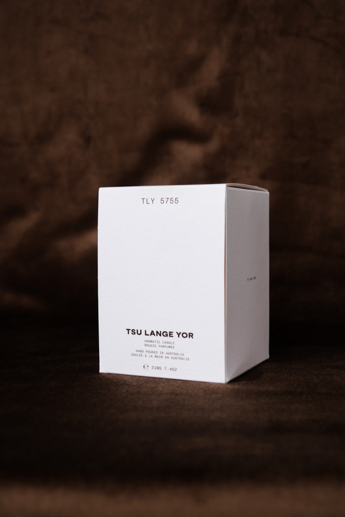 Tsu Lange Yor TLY candle in amber glass—dry spice, woods, musk, green. TLY 5755 is an observance of native AU fragrance and material. Warmth, spice, herbaceousness culminate in calm yet sophisticated quiet. Feelings of smooth velvet, worn wooden furnishings, close heat, crisp forest air. Scent was made in collaboration with Craig Andrade of the Raconteur.