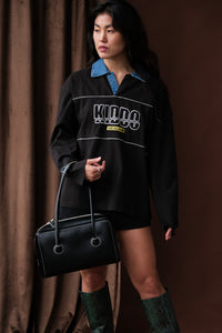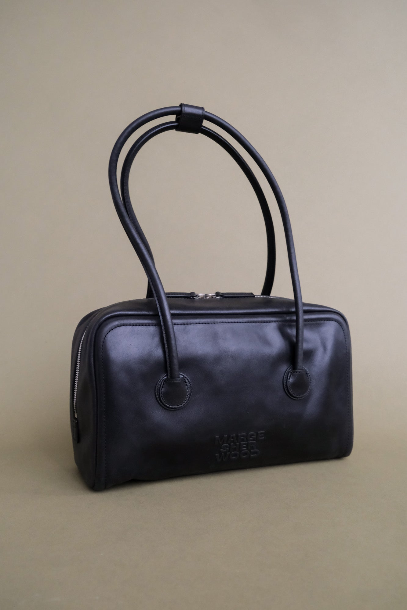 Margesherwood rectangular soft Boston bag in worn black pullup. Two way zipper, white contrast stitching, and embossed logo.