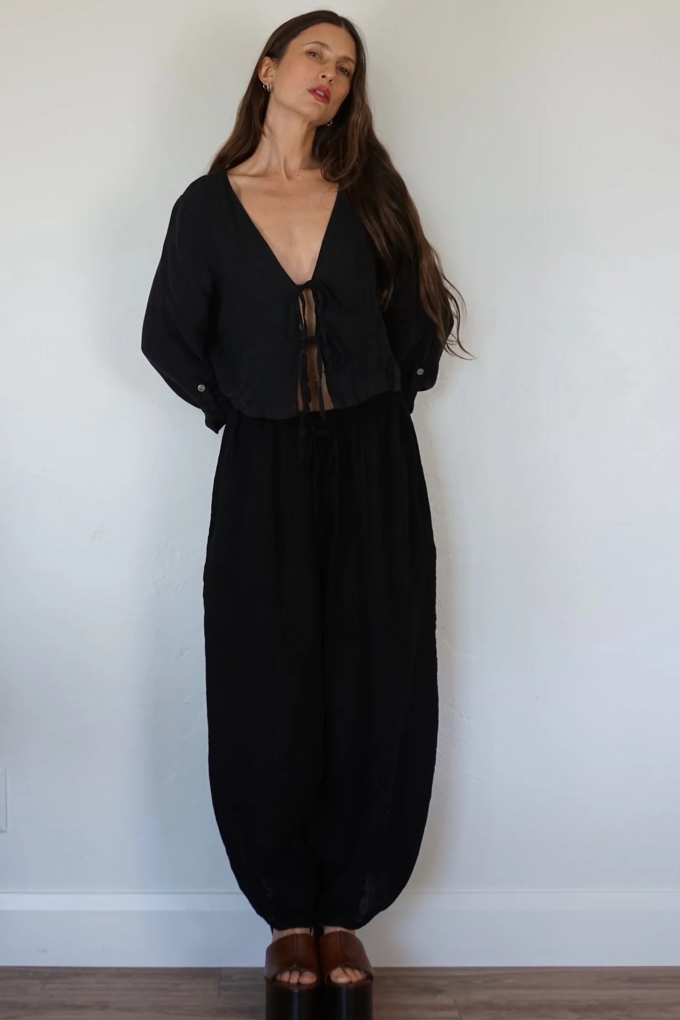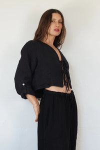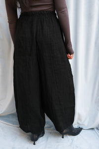 Shani barrel leg linen chloe pant in black. Elastic waist and drawstring.