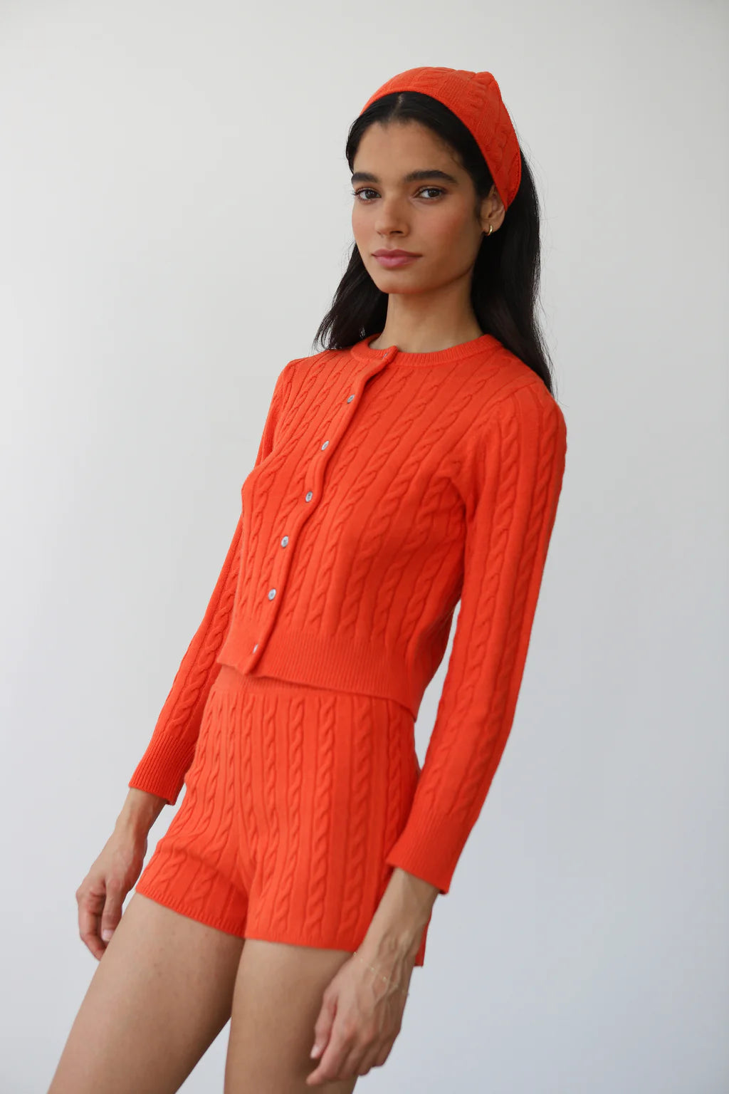 Callahan cable knit Valerie micro short in poppy red orange. Pair with the Valerie cardigan and headscarf for a matching set.