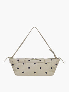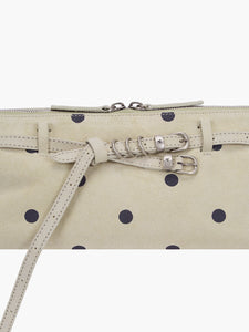 Margesherwood baguette shaped Grandma used sling bag in blond wood printed suede polka dot. Zip closure.