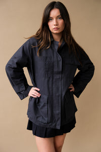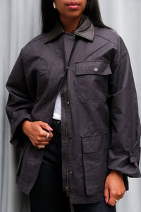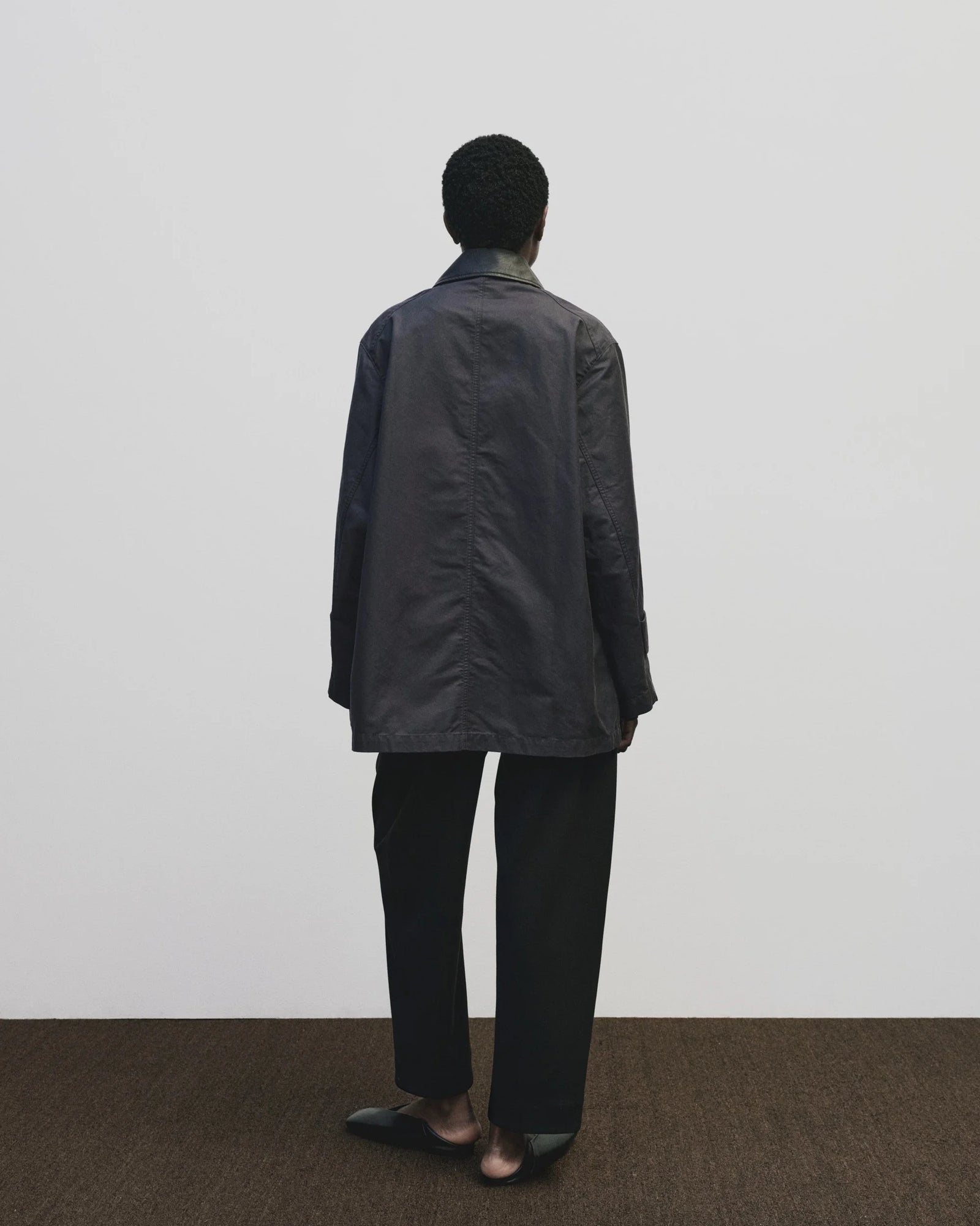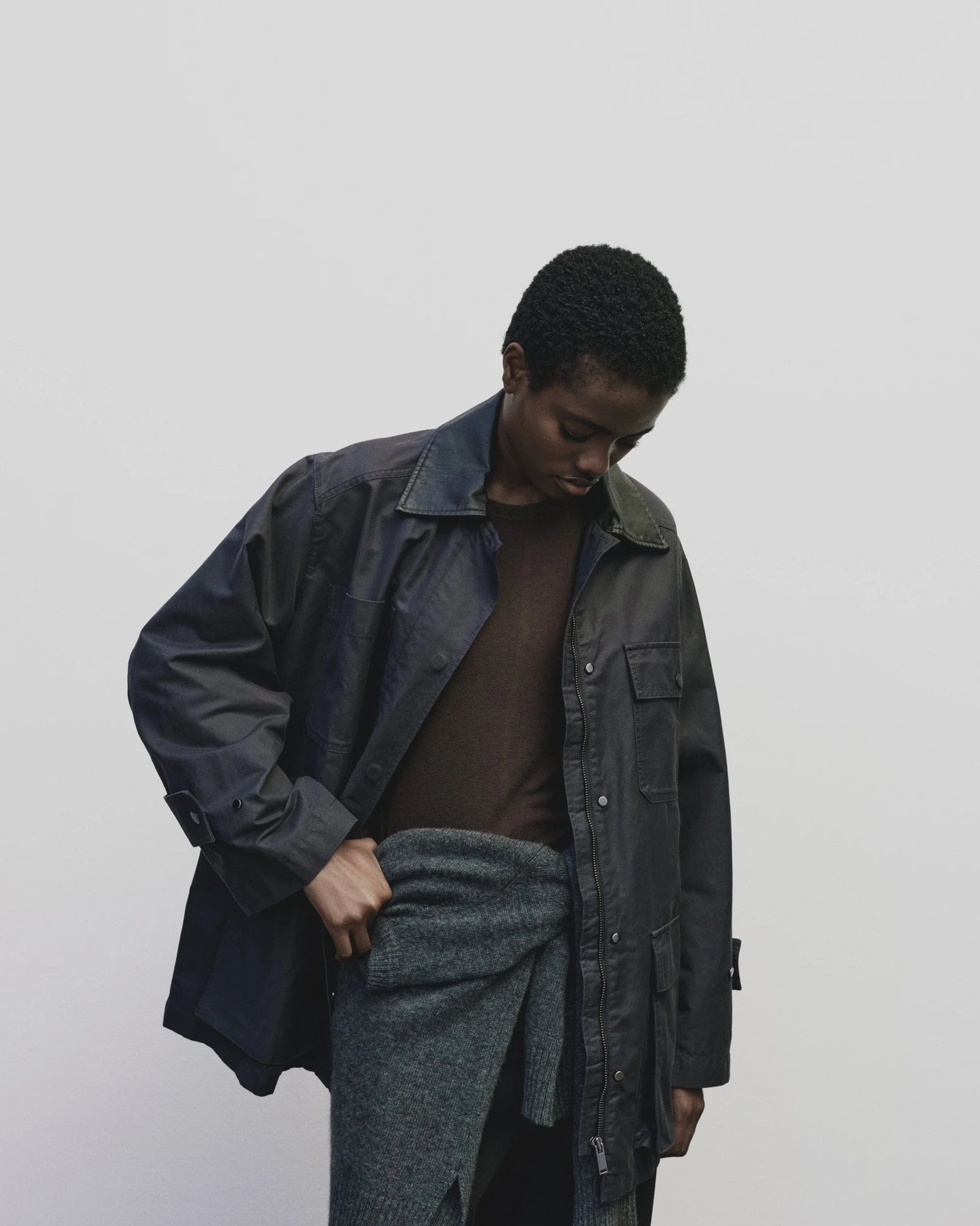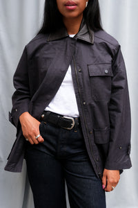 Mijeong Park oversized contrast collar chore work jacket in navy. Mid-weight cotton blend fabric, drop shoulders, front patch pockets, front zip & metal snap closure, unlined.