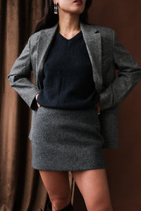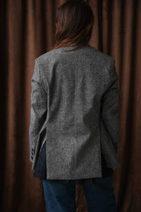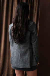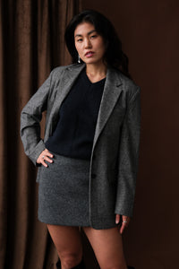 Mijeong Park wool blend oversized blazer jacket in marled gray. Notched collar, dropped shoulders, one chest pocket, two front flap pockets, double back vent. Fully lined. Pair with the matching trousers for a full matching suit.