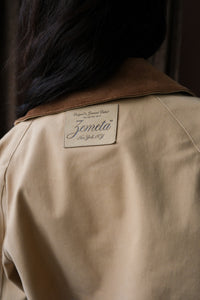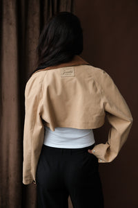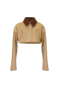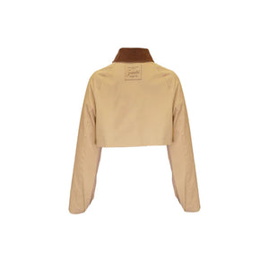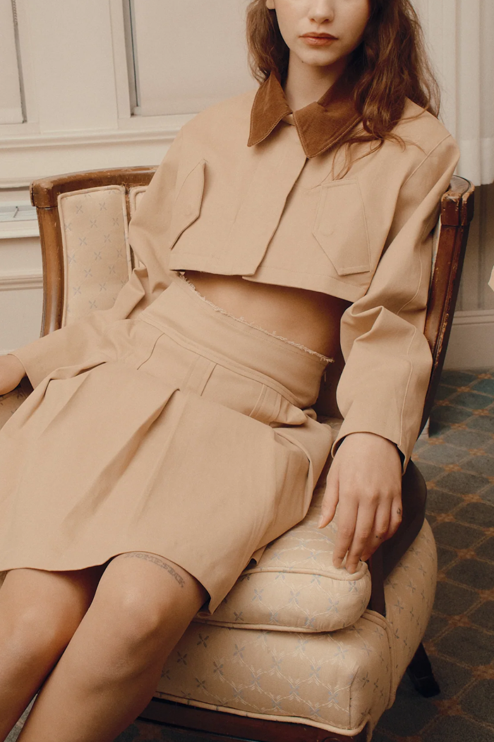 Zemeta Park Walk Crop Jacket blends timeless trench coat style with a modern twist. Textured corduroy contrast collar.