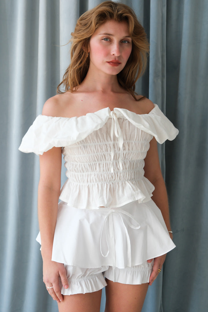 Allina Liu ruffled hem Tulip bloomers in white. Bias cut mini-skirt overlay, sewn on tie at center front (does not cinch), invisible side seam zipper with baby hook & eye. Elastic at leg openings,