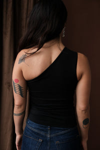 Tyler Mcgillivary black one shoulder equestrian white horse tank top.